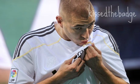Benzema kissed the Real Madrid badge when he was unveiled at the Santiago Bernabéu stadium following his €35 million move from Lyon.