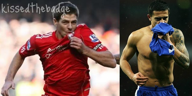 Who will be kissing the badge on Saturday? Tim Cahill (pictured here kissing his shirt after the 2-2 draw with Arsenal in January 2010) or Steven Gerrard?