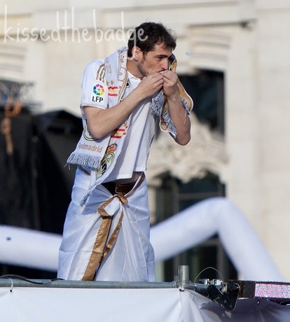 During Real Madrid’s celebrations at Cibeles Square for their first league title since 2008, Iker Casillas kisses his team’s shield